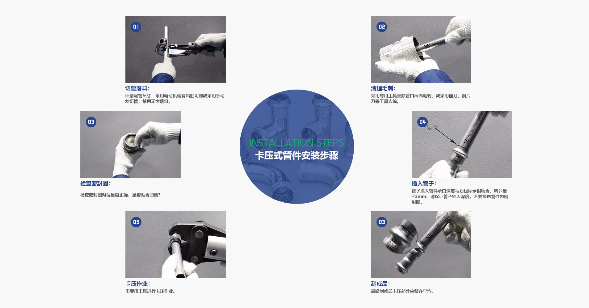 8、安裝簡便:將管子插入管件后用專用的工具卡壓到位即可,比傳統的焊接或者絲接口簡便。